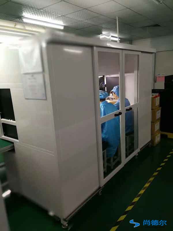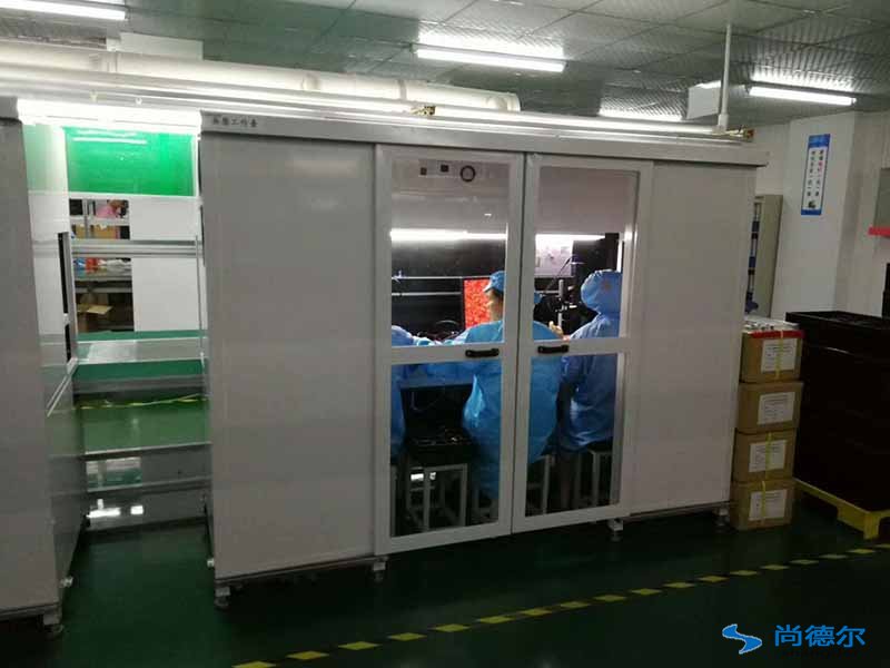 深圳尚德爾凈化設備有限公司給廣州科易光電技術有限公司做的移動式無塵工作臺,我司施工人員安裝的FFU可移動式無塵工作臺按時順利完工。科易光電工程完工驗收完畢,目前已正常投入生產中。以下圖為操作人員在移動式無塵工作臺生產圖。