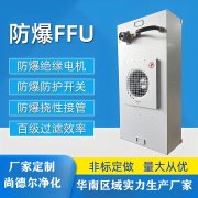 深圳市尚德爾凈化設備有限公司是防爆FFU凈化單元生產廠商。防爆FFU,是一種自帶動力具有過濾功能的末端送風裝置;風機從頂部將空氣吸 入并經HEPA過濾,過濾后將潔凈空氣從出風面均勻送出,為潔凈環境提供潔凈空氣和微粒過濾控制。 各種FFU最多由以下幾部分組成(按從上到下、從內到外的順序),視不同廠家組成部分可能有所減少。 1、預過濾器;2、外殼體;3、防爆接線管;4、防爆電機5、葉輪;6、防爆接線盒;7、過濾器;8、金 屬防護網;9、刀緣;10、控制元件 分體形狀的FFU有如下優勢:① 使過濾器的更換變得方便;② 減小了安裝過程中的勞動強度; 整體形狀的 防爆FFU有如下優勢:① 增加了FFU的密封性,有效防止了泄漏。② 有利于降低噪音。③ 有利于減小振動